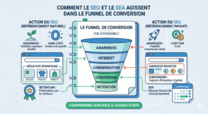Visualiser le funnel de conversion permet de comprendre pourquoi SEA et SEO ne s’opposent pas — ils couvrent des zones différentes du parcours prospect.